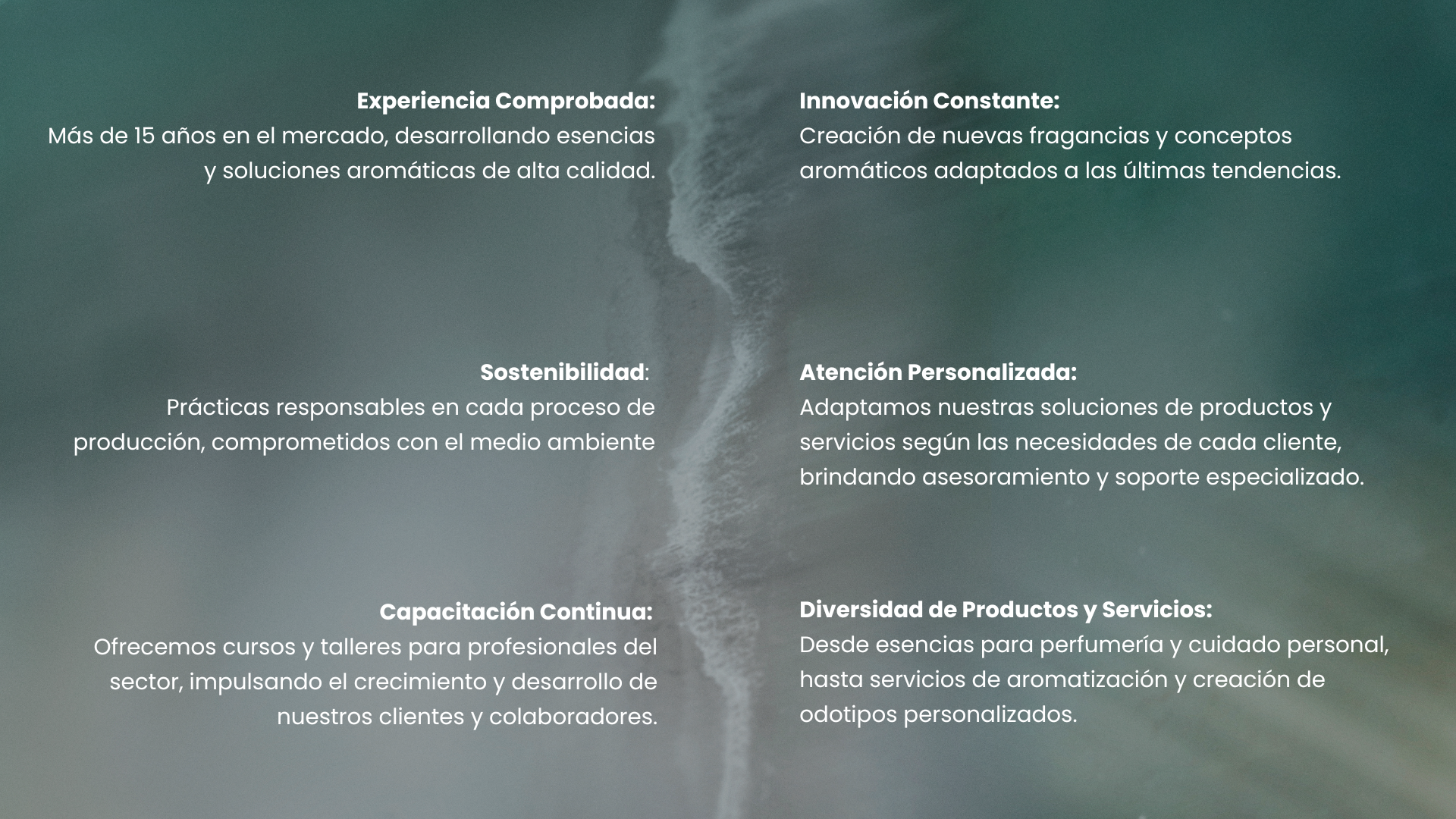 Nuestra visión se centra en la sostenibilidad, la innovación y la excelencia. También promovemos el desarrollo continuo a través de capacitaciones sincrónicas y asincrónicas, donde compartimos nuestro conocimiento en perfumería, aromatización y marketing olfativo con nuestros clientes y colaboradores.